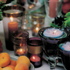 Τρία ή περισσότερα μεταλλικά δοχεία, όπως γλαστράκια, κουβαδάκια, ποτιστήρια ακόμη και μεταλλικά φορμάκια για κρέμα καραμελέ σε διάφορα μεγέθη (πάντα όμως σχετικά μικρά) γεμάτα νερό και μερικά επιπλέοντα κεριά, μπορούν να δώσουν ένα ανάλαφρο και νεανικό ύφος στη δεξίωση. Δεν χρειάζεται να είναι ίδια, μπορείτε να κάνετε συνδυασμούς ακόμη και από τραπέζι σε τραπέζι. Μια καλή ιδέα είναι να τυλίξετε γύρω τους ένα κομμάτι τούλι στα χρώματα που επικρατούν στο concept ή μια φαρδιά κορδέλα.